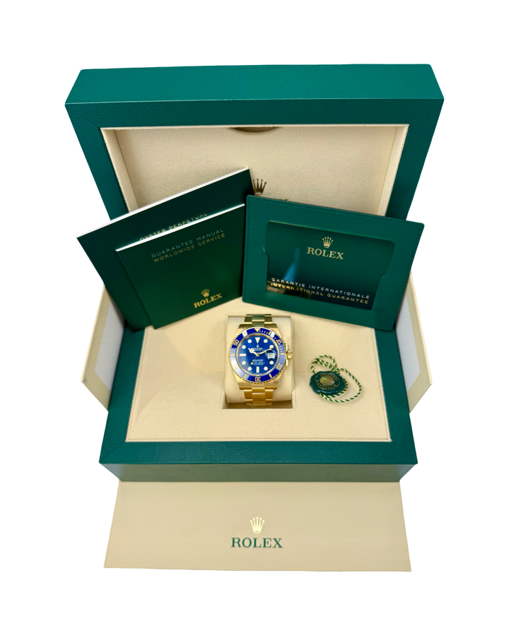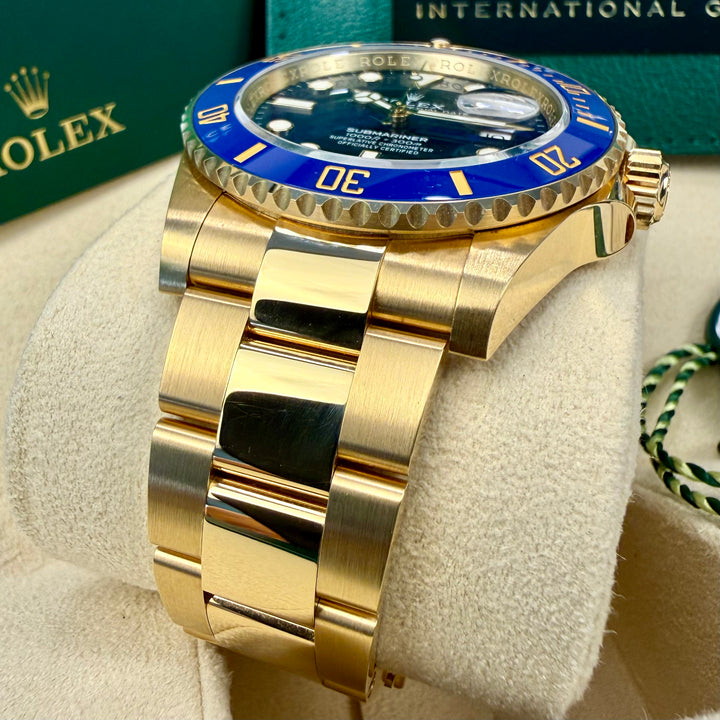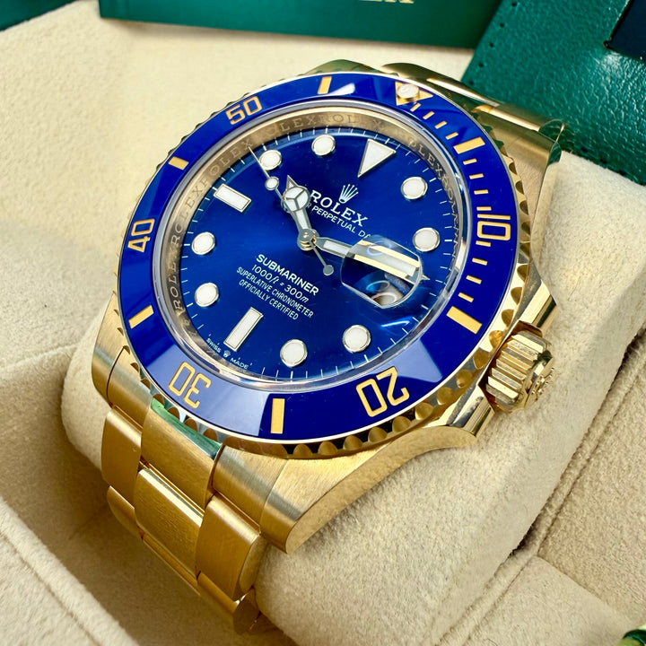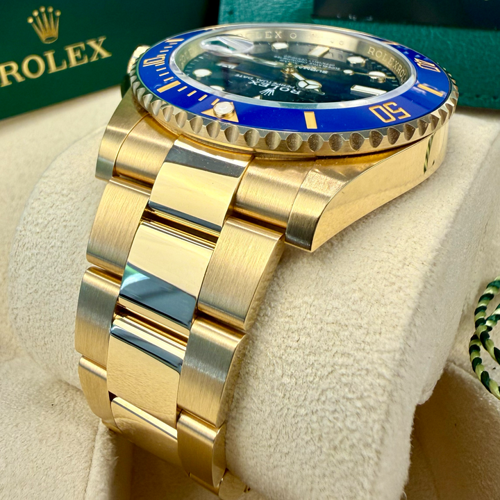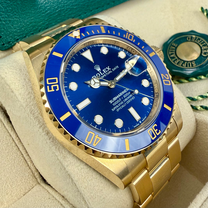 Die Rolex Submariner Date 126618LB, auch bekannt als „Bluesy“, ist der Inbegriff von Luxus unter den Taucheruhren. Das Modell aus August 2025 kombiniert die ikonische Submariner-DNA mit einem Gehäuse und Armband aus massivem 18 Karat Gelbgold. Das harmonische Zusammenspiel von blauem Zifferblatt und blauer Cerachrom-Lünette sorgt für einen unverwechselbaren Auftritt. Diese Uhr kommt ungetragen, teilverklebt und mit originaler deutscher Erstkaufrechnung.
